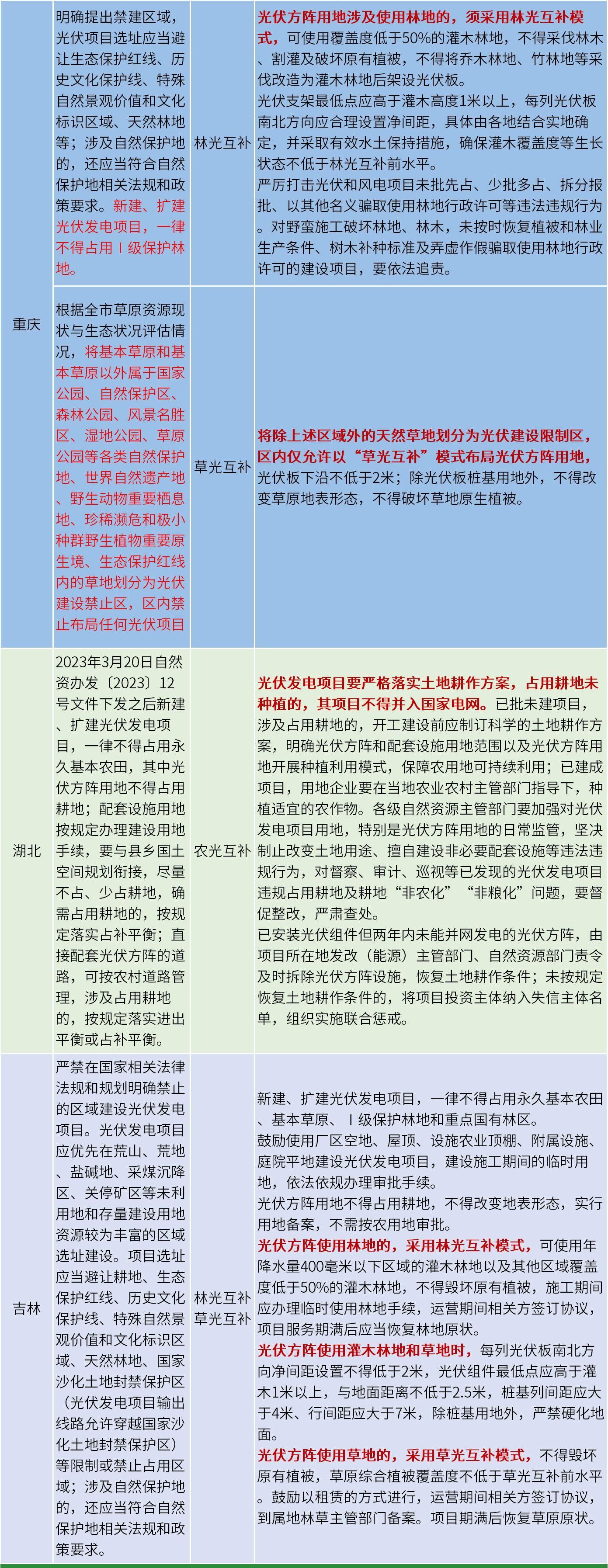 重慶發文明確,將基本草原和基本草原以外屬于國家公園、自然保護區、森林公園、風景名勝區、濕地公園、草原公園等各類自然保護地、世界自然遺產地、野生動物重要棲息地、珍稀瀕危和極小種群野生植物重要原生境、生態保護紅線內的草地劃分為光伏建設禁止區,區內禁止布局任何光伏項目;將除上述區域外的天然草地劃分為光伏建設限制區,區內僅允許以“草光互補”模式布局光伏方陣用地。