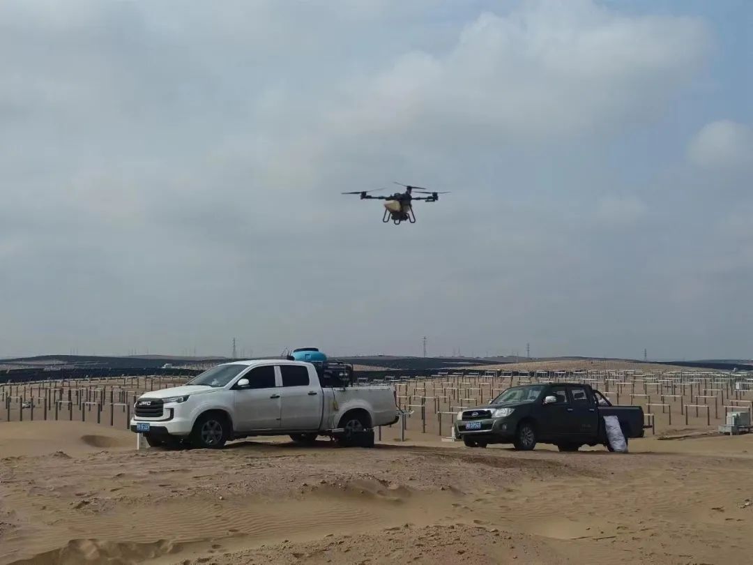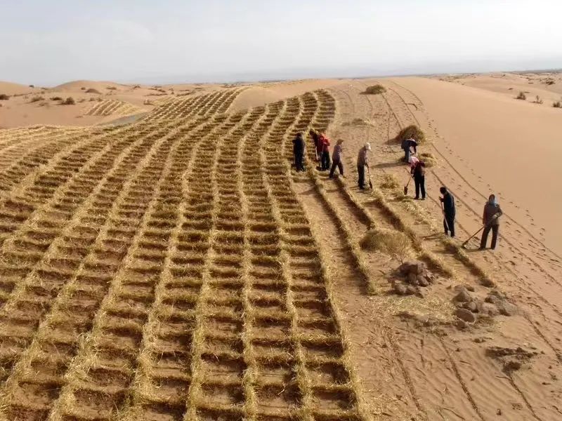 在治沙工程現場,工程師根據風向大數據模型精準規劃,指導工人定位種植,促使風吹、樹擋、沙降的自然力與人力相互作用;工人兩人一組,一人手持水槍在沙地上沖出種植微孔,另一人迅速跟上點插樹苗,10秒種下一棵小樹苗。