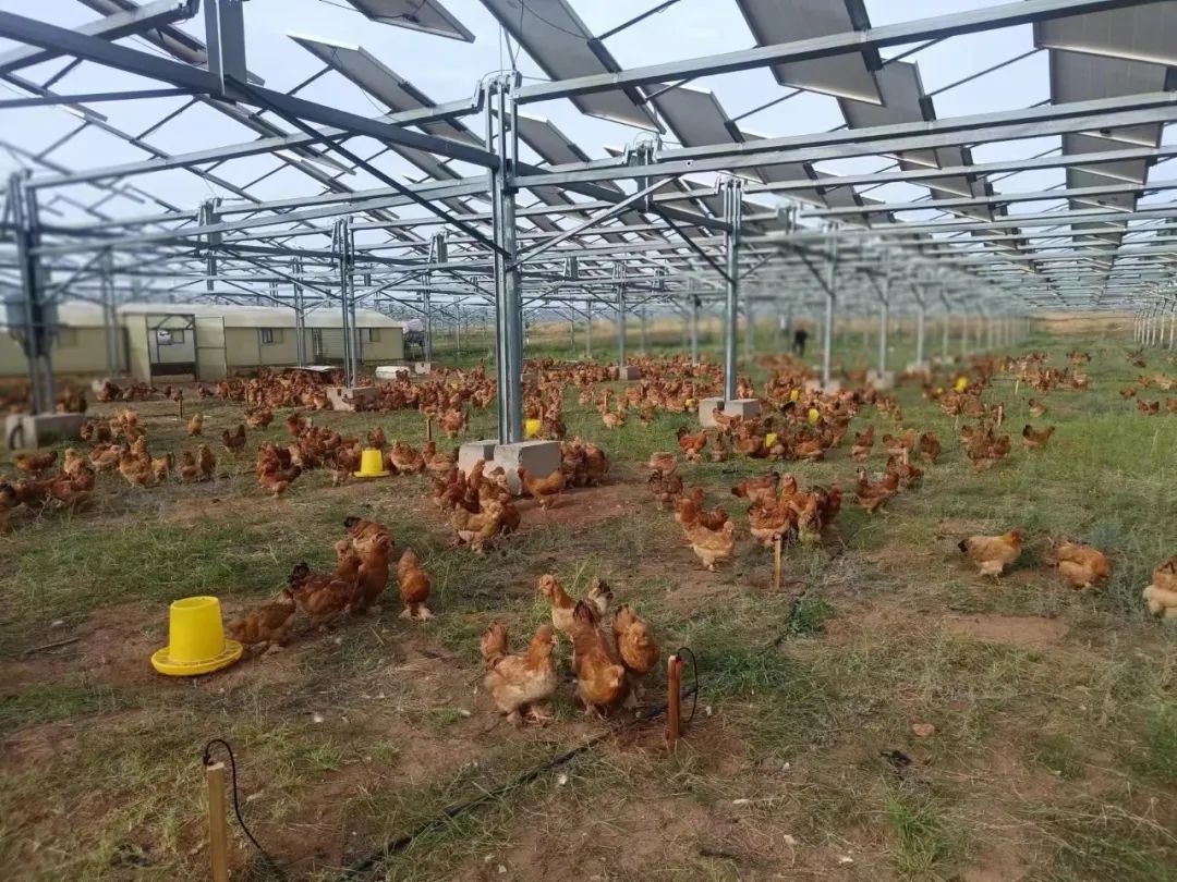 光伏板下,一大群雞正在悠閑地散步、覓食,時不時發出歡快的鳴叫,為寂靜的沙漠帶來勃勃生機。據王繼業介紹,這是庫布其光伏治沙項目打造的1000畝沙漠牧雞養殖項目,首批養殖5000只,將新能源發電產業同沙漠生態治理以及現代農牧養殖業有機結合,進行生態保護和經濟發展兼顧的良性循環體系的初步探索。