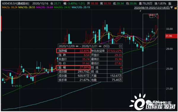 通威股份自12月9日披露非公開發(fā)行股票發(fā)行情況報告書顯示高瓴資本入股后,10日股價大漲8.65%;截至12月18日,股價累積漲幅近30%。