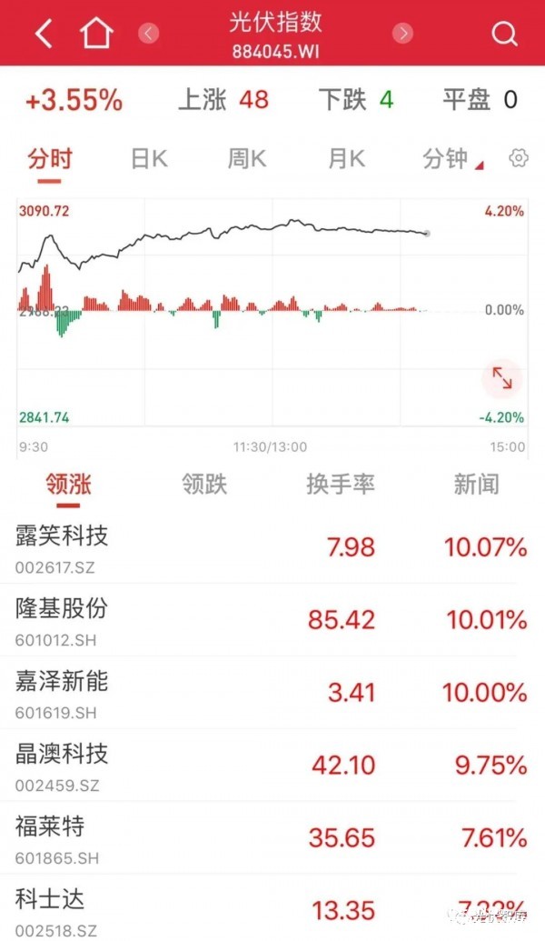 隆基股份的走強也帶動了光伏板塊的走強,截至午間收盤,Wind光伏指數(shù)上漲,除隆基股份上漲10%外,板塊內(nèi)露笑科技、嘉澤新能漲停。